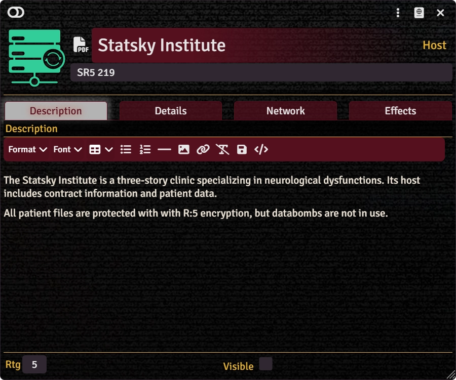 We currently have 57 articles on SR5 Foundry VTT System Wiki. Type your article name above or click on one of the titles below and start writing!