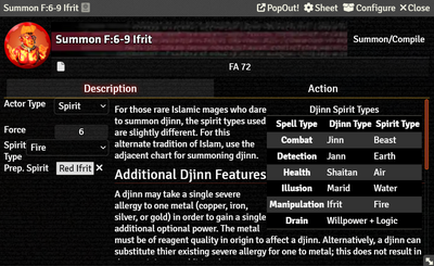 The Action Tab functions very similar to the one on an Action Item[git 2], but only includes the options relevant to creating the selected entity type. The Test is locked to either Summon Spirit