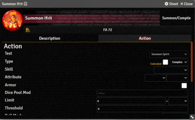 , changing the labels below and controlling the Test and Opposed Test on the Action Tab. - Force (for Spirits) or Level (for Sprites) controls the power of the entity being called, and automatically factors into the Drain or Fade Resistance Test.