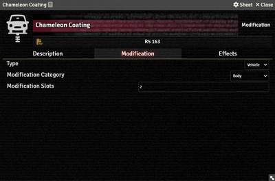 allows for configuring the category and type of vehicle modification, which will be tabulated on the Vehicle's Vehicle Tab. Note that it does have any options that adjust the properties of a vehicle; see Active Effects for how to implement statistical changes.